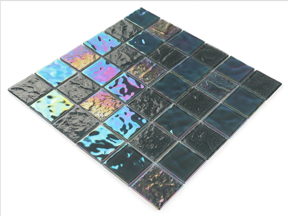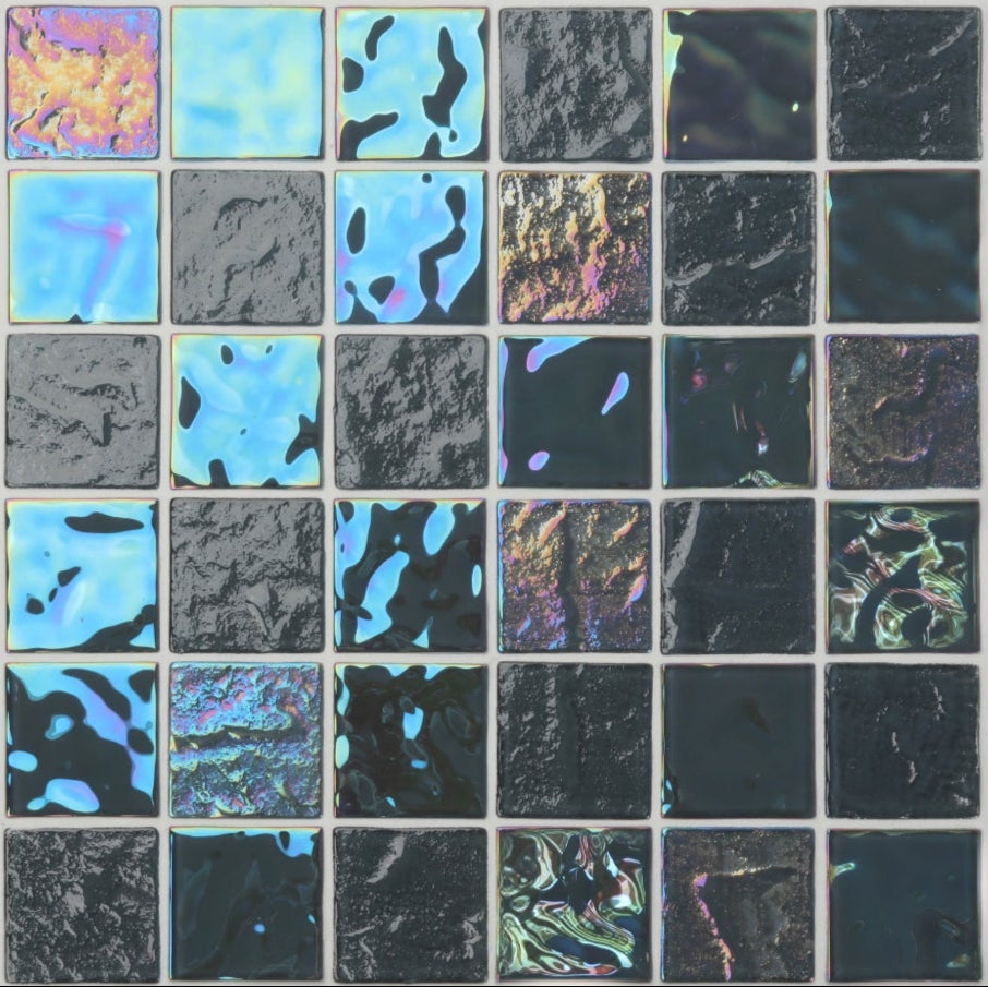 Make a bold statement with our black shimmer-textured tile. Its deep, rich black base combined with a subtle iridescent shimmer creates a sophisticated, modern look that reflects light beautifully. Perfect for creating luxurious water-safe areas like pools, showers, and accent walls, this tile adds a touch of mystery and elegance, transforming any space into a stylish and refined retreat.
